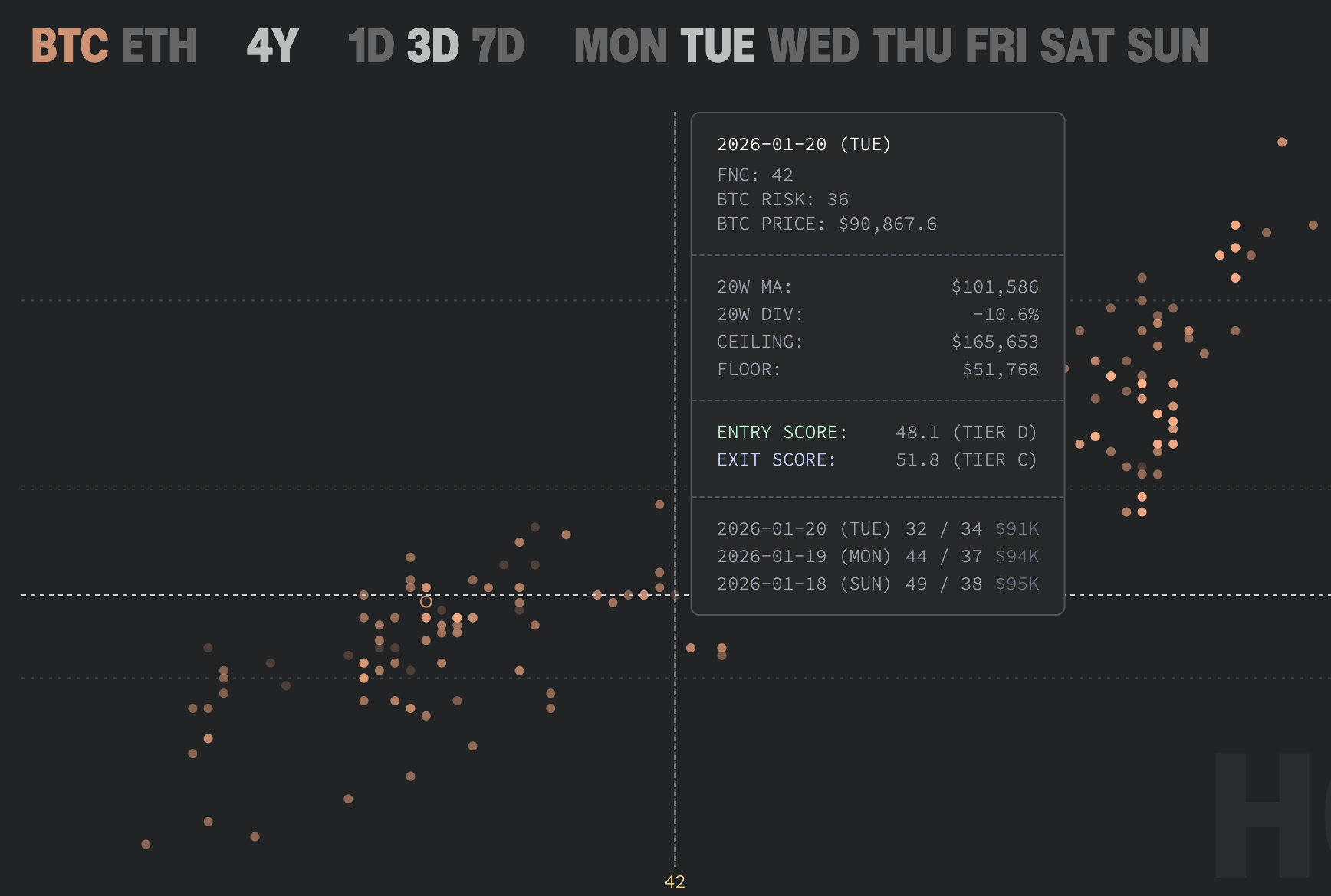 Most tools show sentiment as a timeline. Hashwake maps sentiment to risk. Navigate the market in aggregate — 8 years of data reveal patterns price charts can't show.